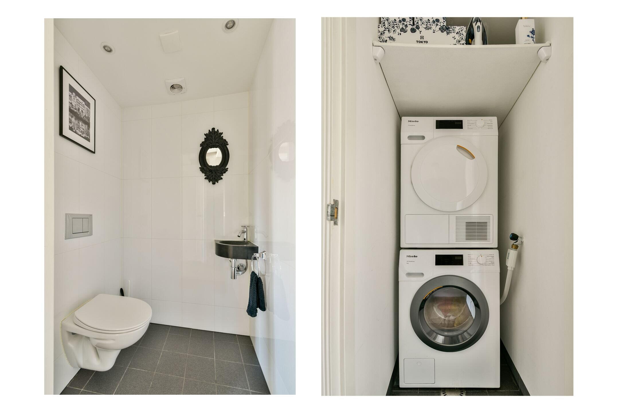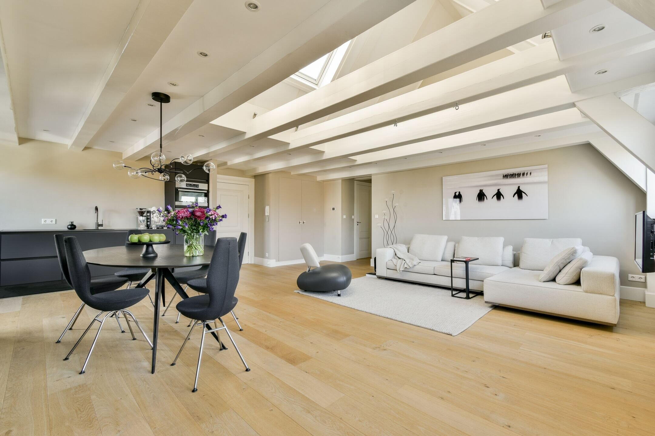 Via het statige en brede trappenhuis bereik je eenvoudig de tweede verdieping in het achterhuis. De lichte woonkamer is voorzien van een stijlvolle open keuken met alle gemakken, zoals een koelkast, combi-oven, inductiekookplaat met geïntegreerd afzuigsysteem, vaatwasser, keramisch werkblad, ruime opbergruimte en een wijnklimaatkast.