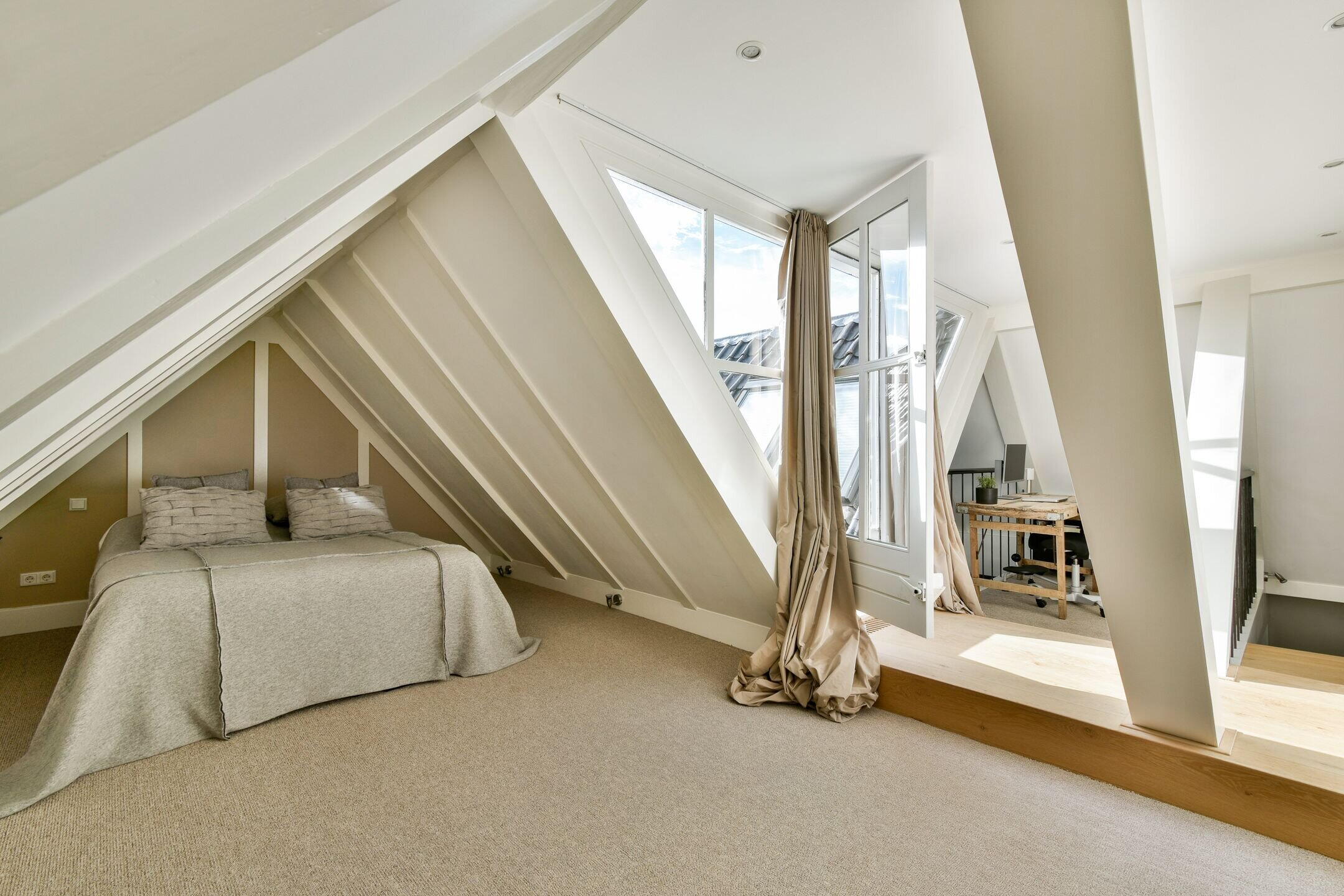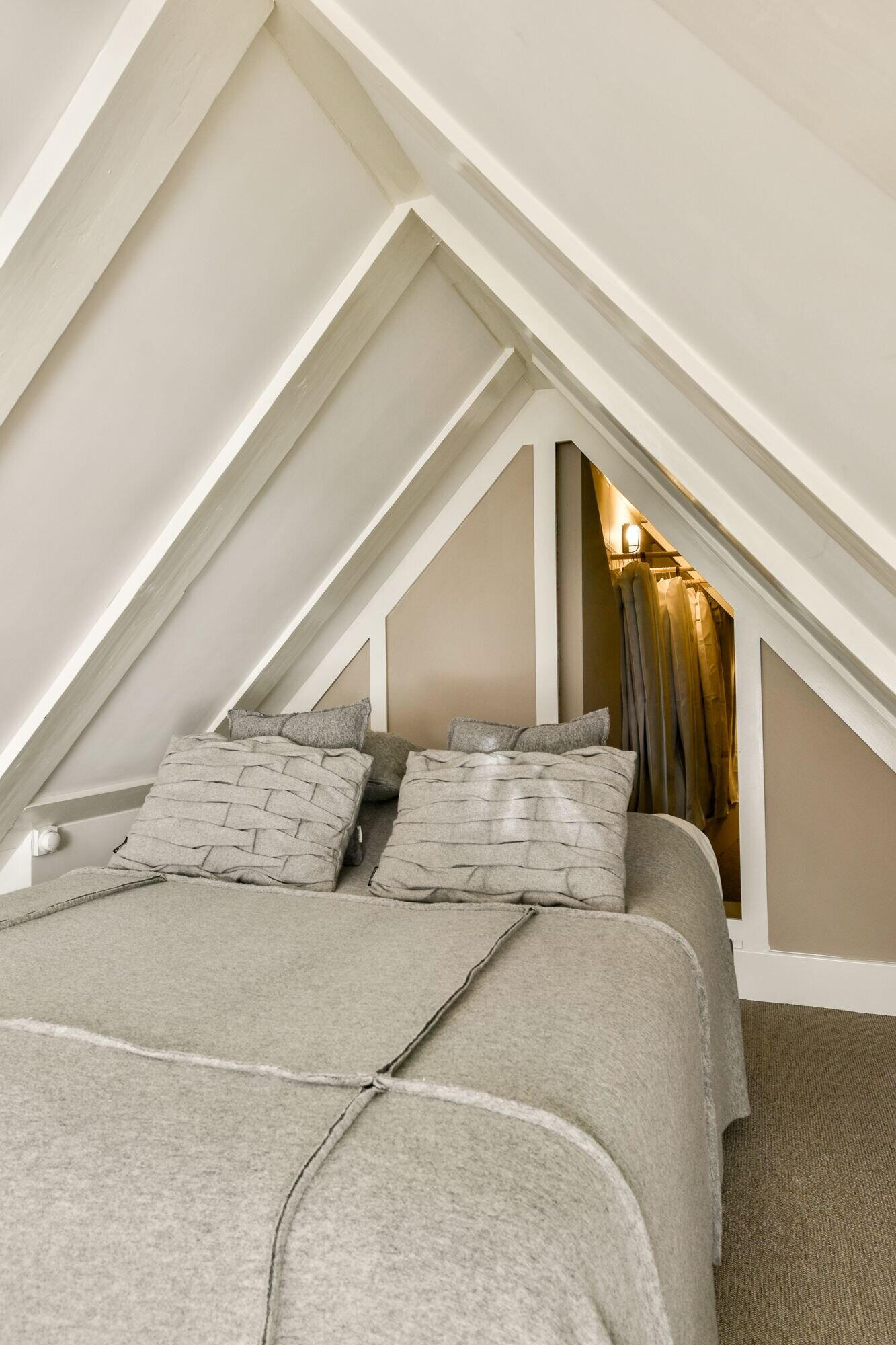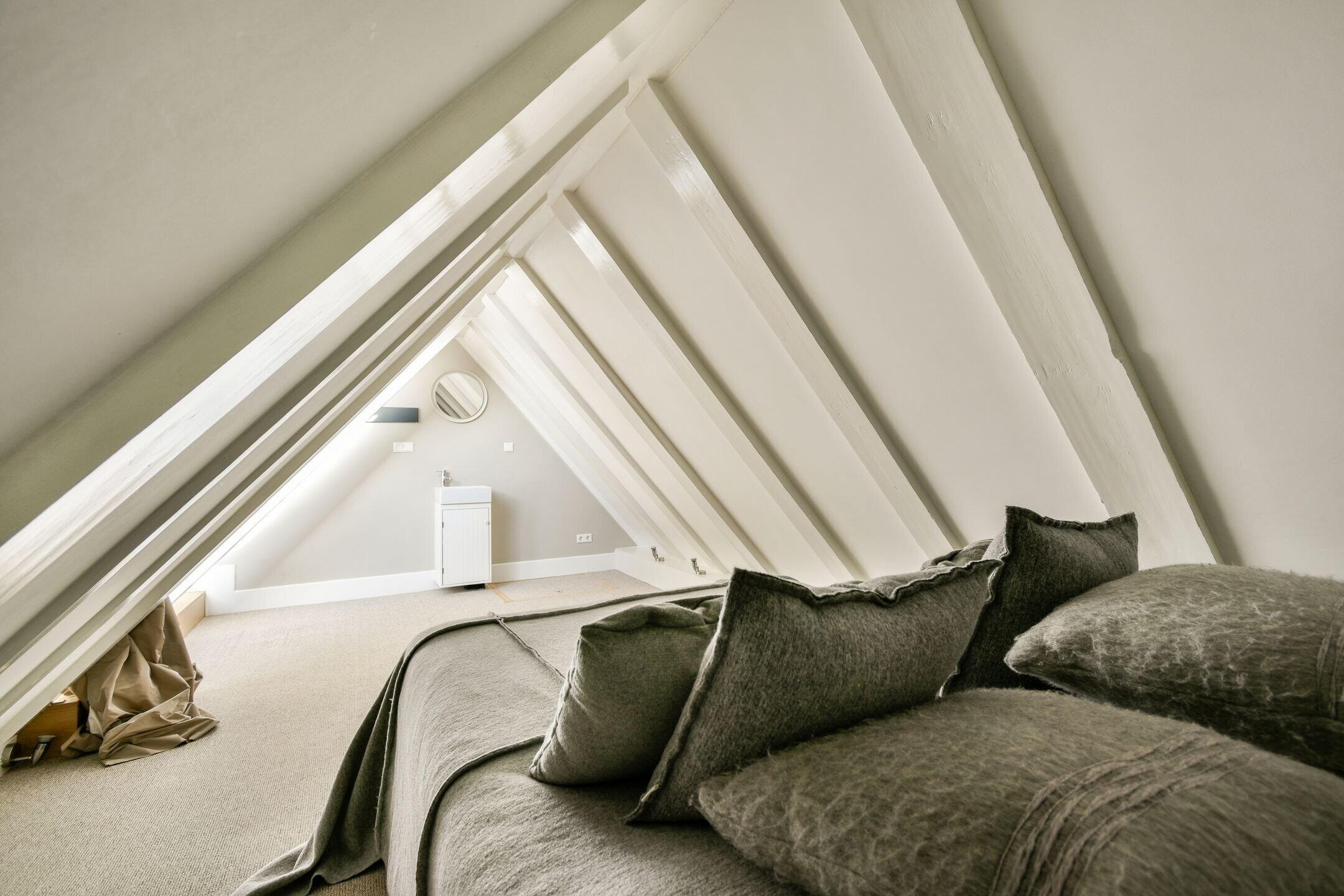 A staircase in the living room leads to the attic floor, where an open space is situated—ideal as a workspace overlooking the living room. Here you will also find a second bedroom with a small sink and a storage area housing the central heating system, as well as an additional walk-in closet/storage room behind the bedroom.