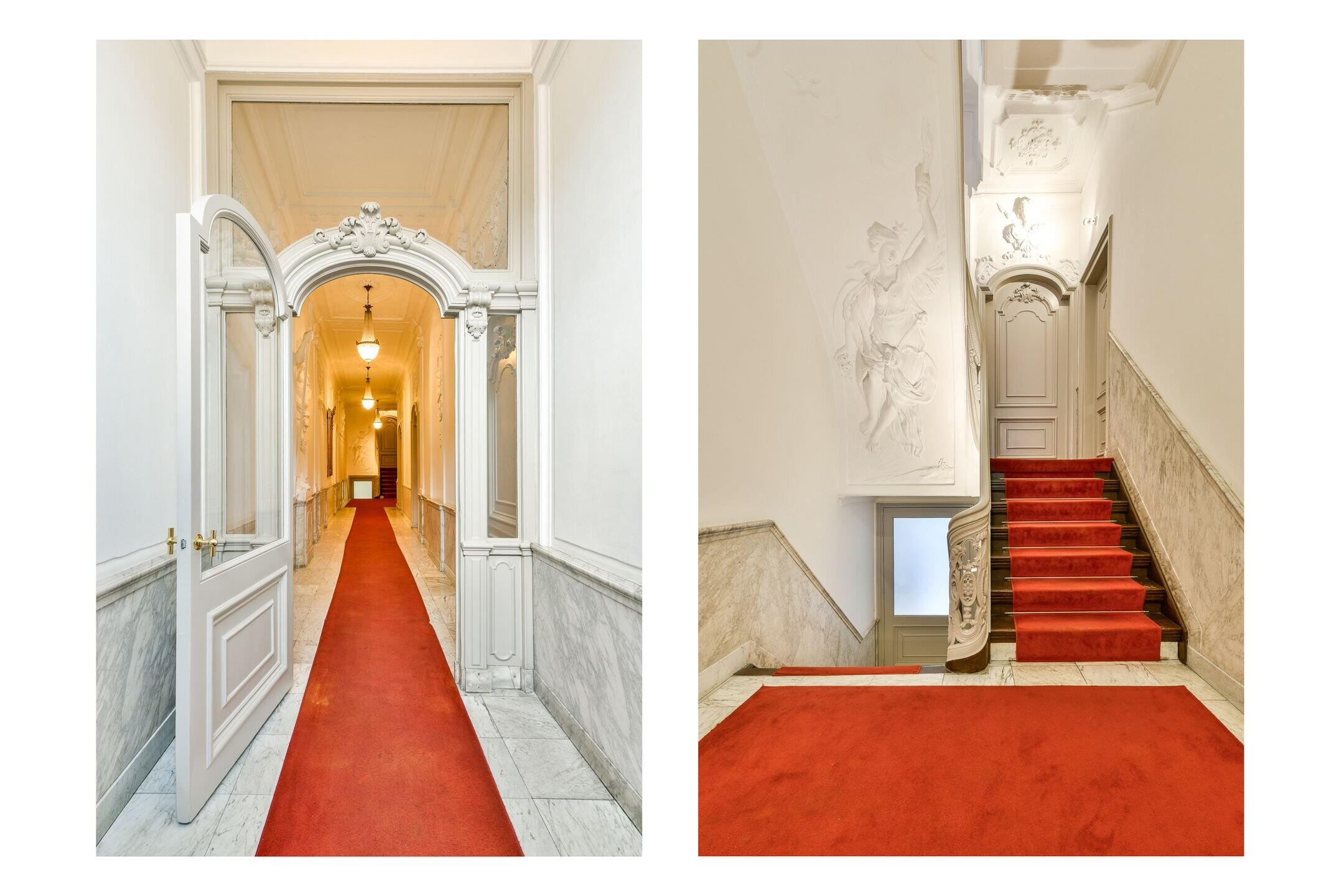 The grand communal entrance on the canal provides access to the long, elegantly plastered corridor, richly decorated with original ornaments, stucco sculptures and high ceilings (over 3 metres), all contributing to the stately appearance. The building itself is an architectural gem with authentic cornices that emphasise its historical character.