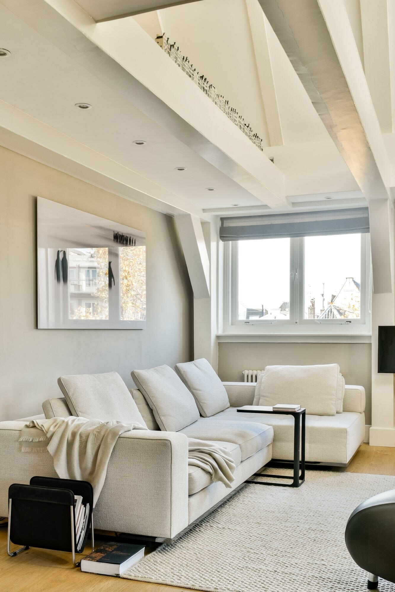 Via deze verdieping is er toegang tot het beschutte terras, gelegen tussen de twee kappen van de bovenwoning. Hier geniet je de hele dag van rust en zon.